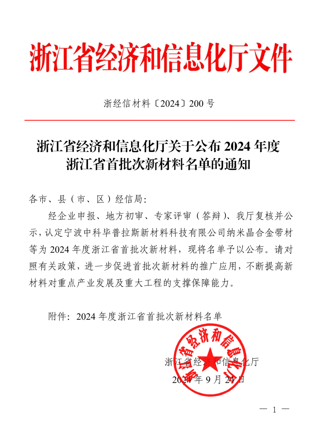 近日,浙江省經濟和信息化廳公布了《2024年度浙江省首批次新材料認定結果》名單